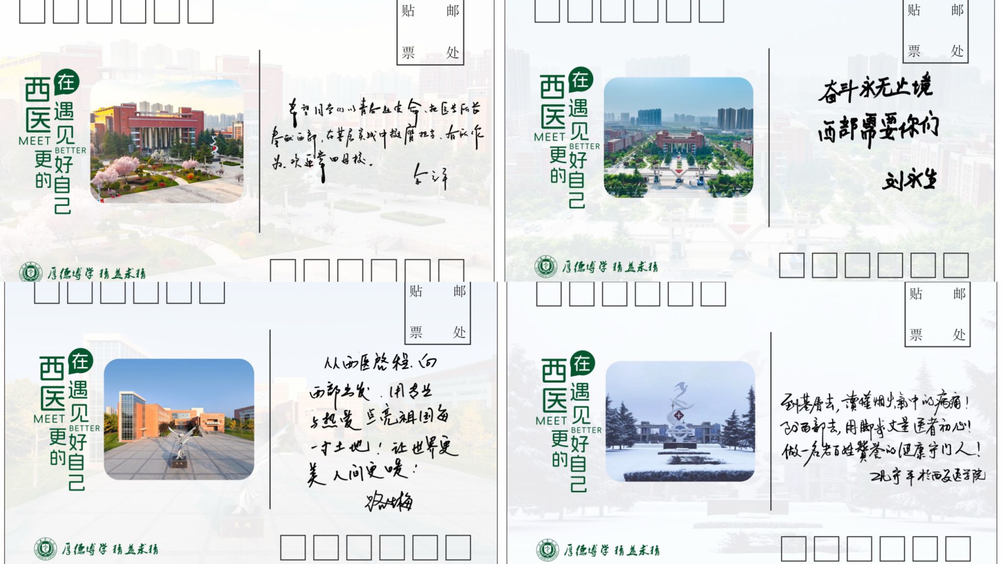 包裹里,是一件厚实的长羽绒服,用以抵御即将到来的凛冽寒冬。比衣物更温暖的,是随箱寄达的四张明信片。提笔人,有以一生守护一方健康的“最美医生”路生梅,有扎根乡土数十载的“中国好人”刘永生,还有校党委书记余立平、校长巩守平。纸短情长,每一句叮嘱与鼓励,都承载着穿越距离的牵挂与关怀。