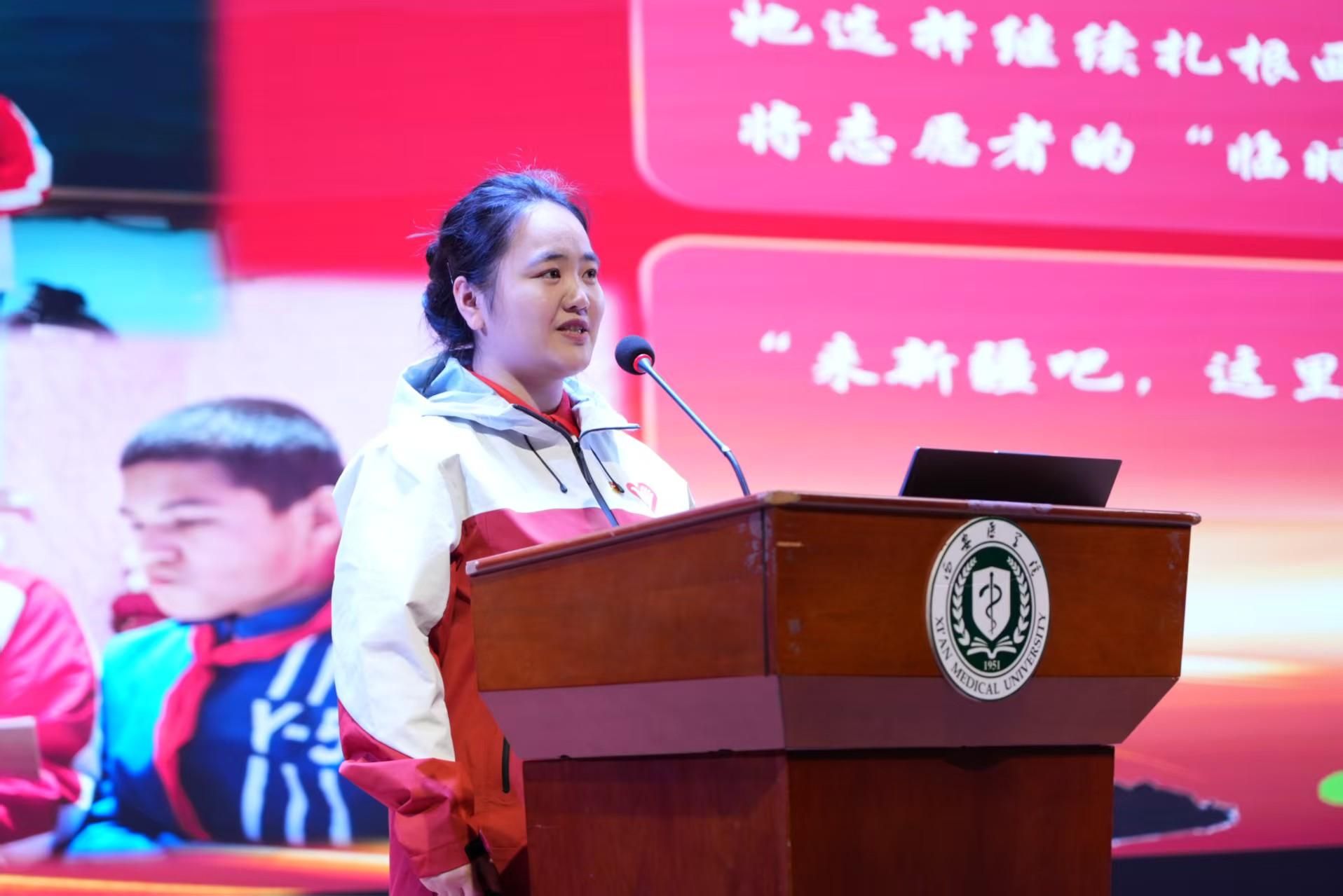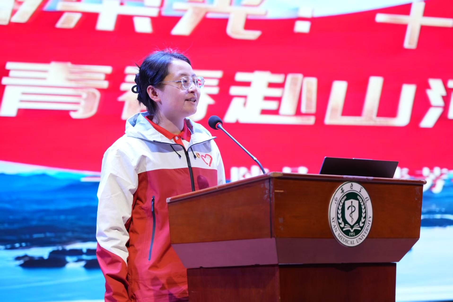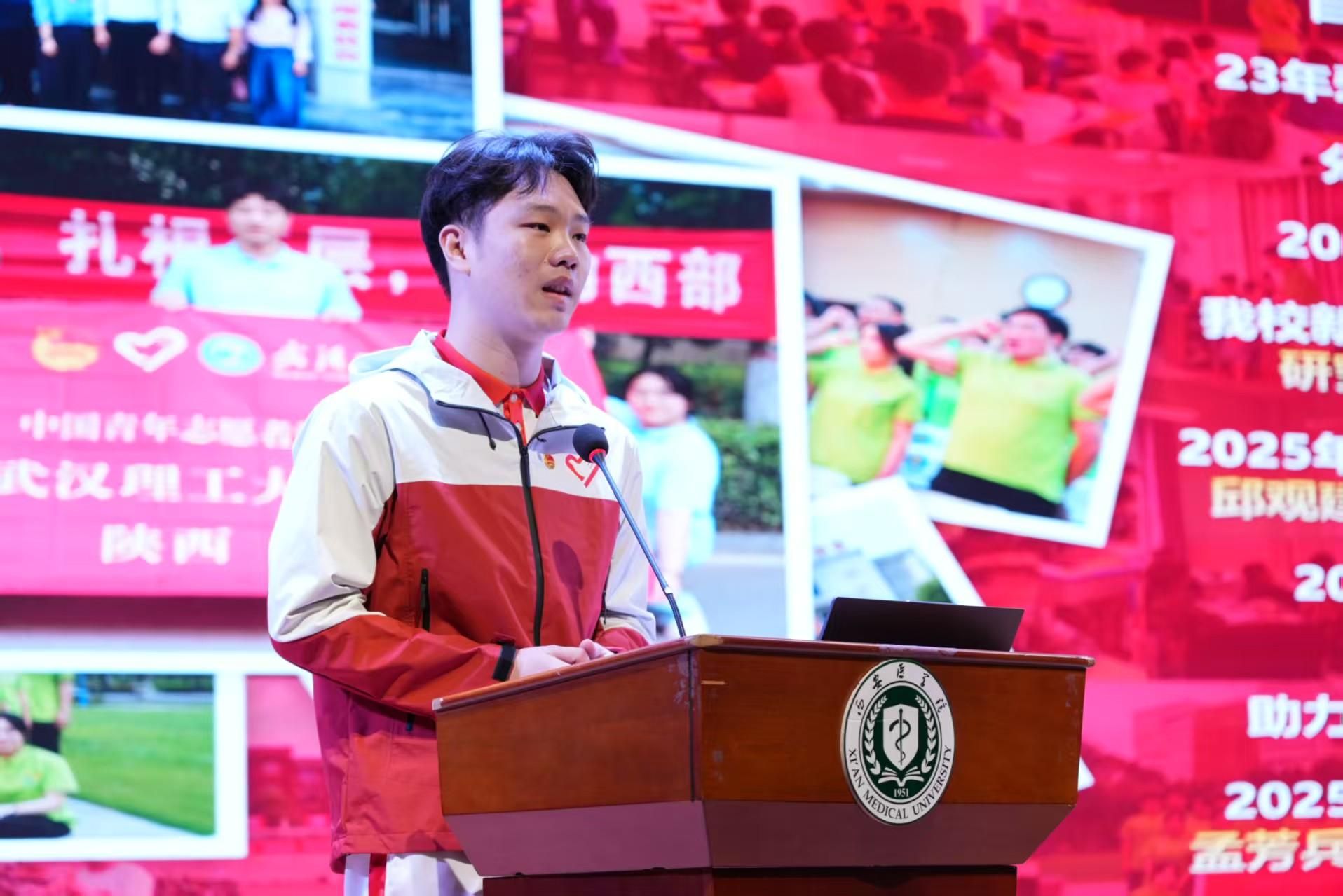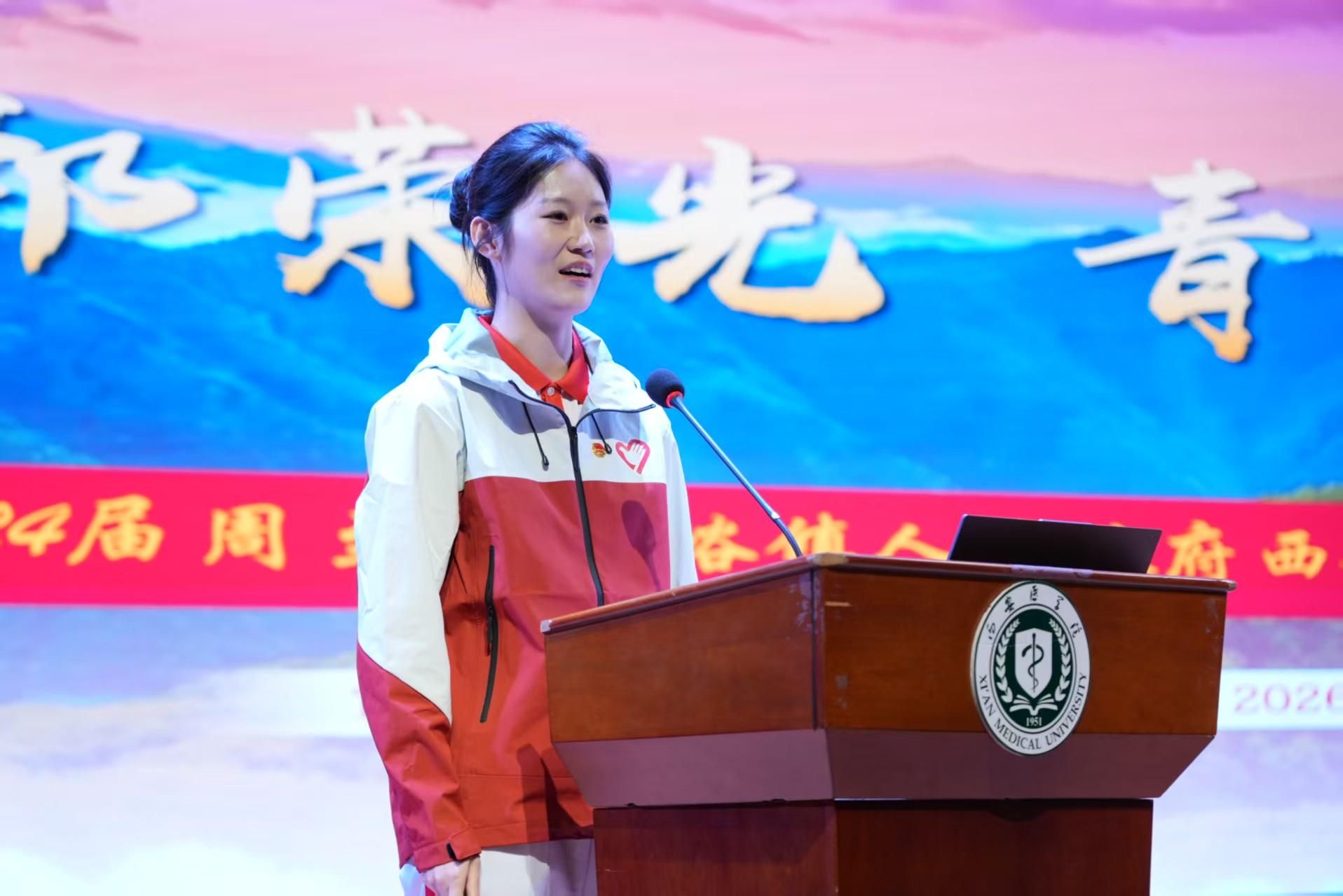 李庆民在致辞中回顾了我校建校以来“面向基层、服务地方,培养高素质应用型医药人才”的办学定位,指出一代代西医学子扎根基层、报效祖国,涌现出郭发刚、毛创泽、邓妮等先进典型。他表示,2025年学校西部计划实现历史性突破,勉励同学们以优秀志愿者和校友为榜样,牢记习近平总书记殷切嘱托,将个人所学与基层所需紧密结合,将青春抱负融入国家战略大局,积极响应时代号召投身西部计划,在服务国家、奉献社会的生动实践中锤炼过硬本领、实现人生价值。